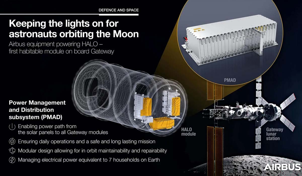 Электроэнергия играет ключевую роль в поддержании жизнедеятельности экипажа и работе систем станции. Именно здесь вступает в действие Airbus с разработкой подсистемы управления и распределения энергии, Power Management and Distribution Subsystem (PMAD), которая обеспечит бесперебойное электропитание HALO и других модулей Gateway.